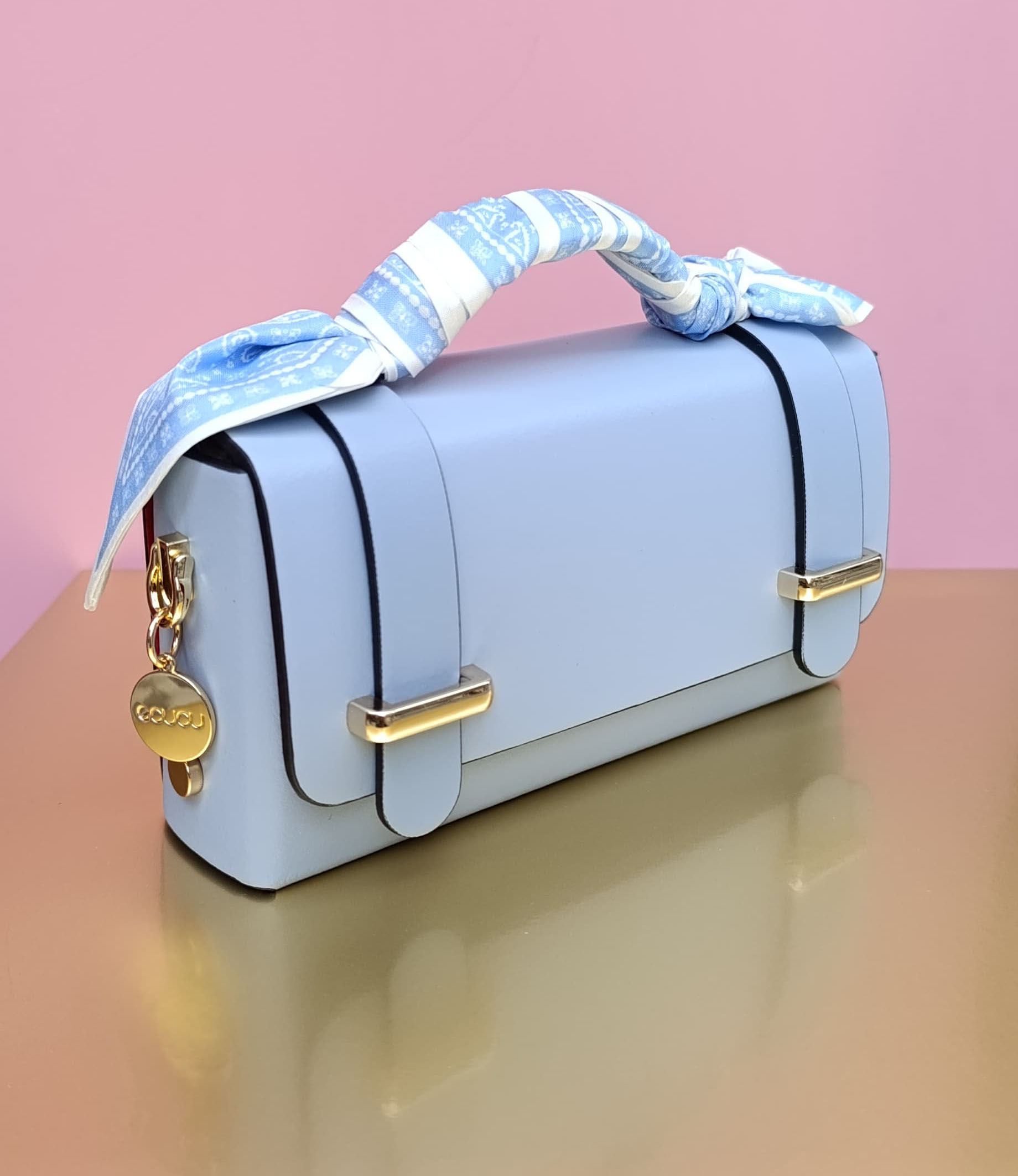 Bolso de piel rígida y estructurada de color azul bebé con interior de color rojo, incluye pañuelo de color aleatorio (siempre elegiremos el pañuelo mas bonito para ese bolso) y correa de cadena dorada. Gran calidad. Tamaño: 19x10x6cm, perfecto para llevar todo lo necesario.