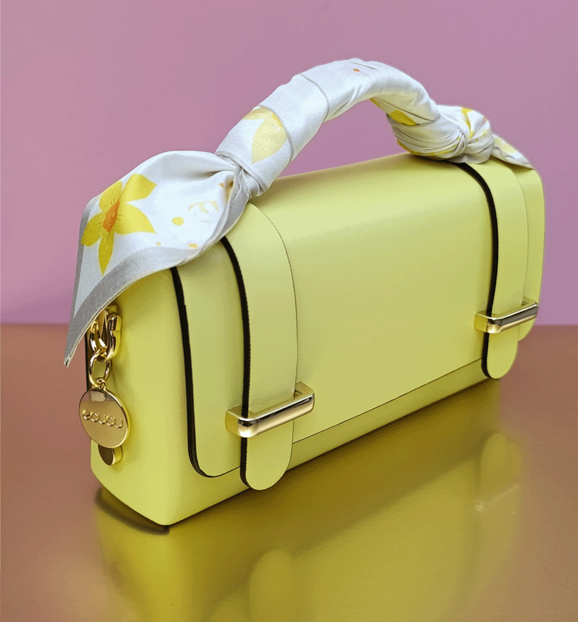 Bolso de piel rígida y estructurada de color amarillo lima con interior de color rojo, incluye pañuelo de color aleatorio y correa de cadena dorada. Gran calidad. Tamaño: 19x10x6cm, perfecto para llevar todo lo necesario.