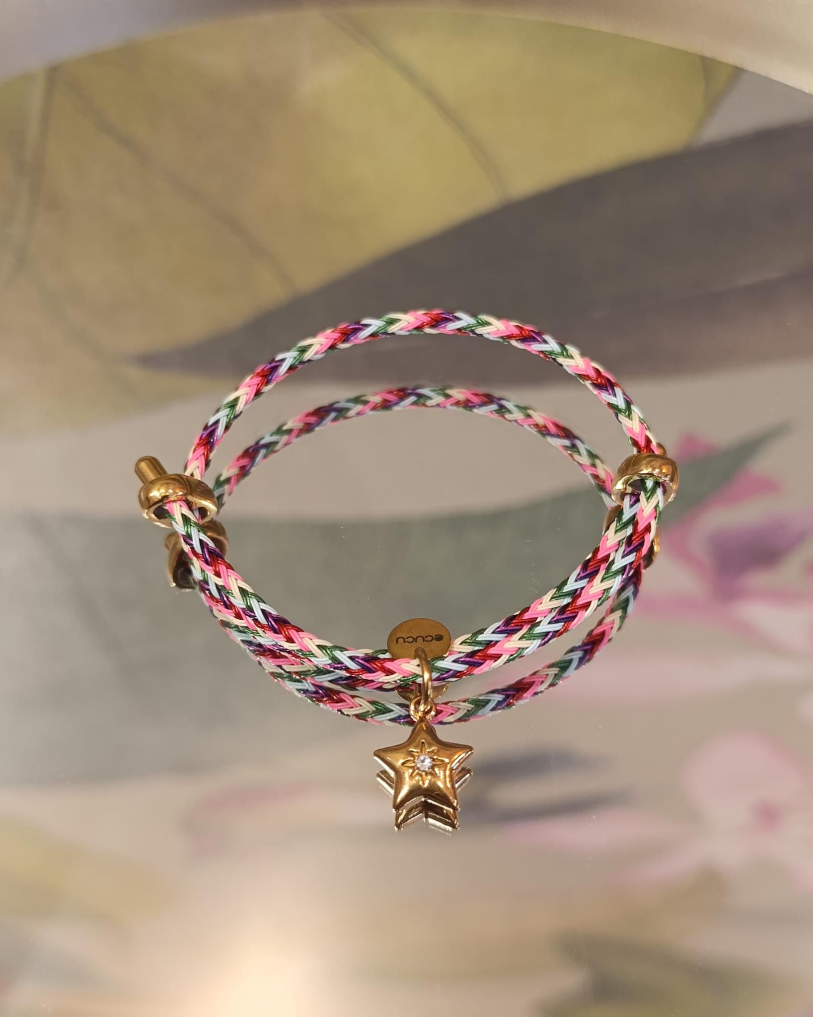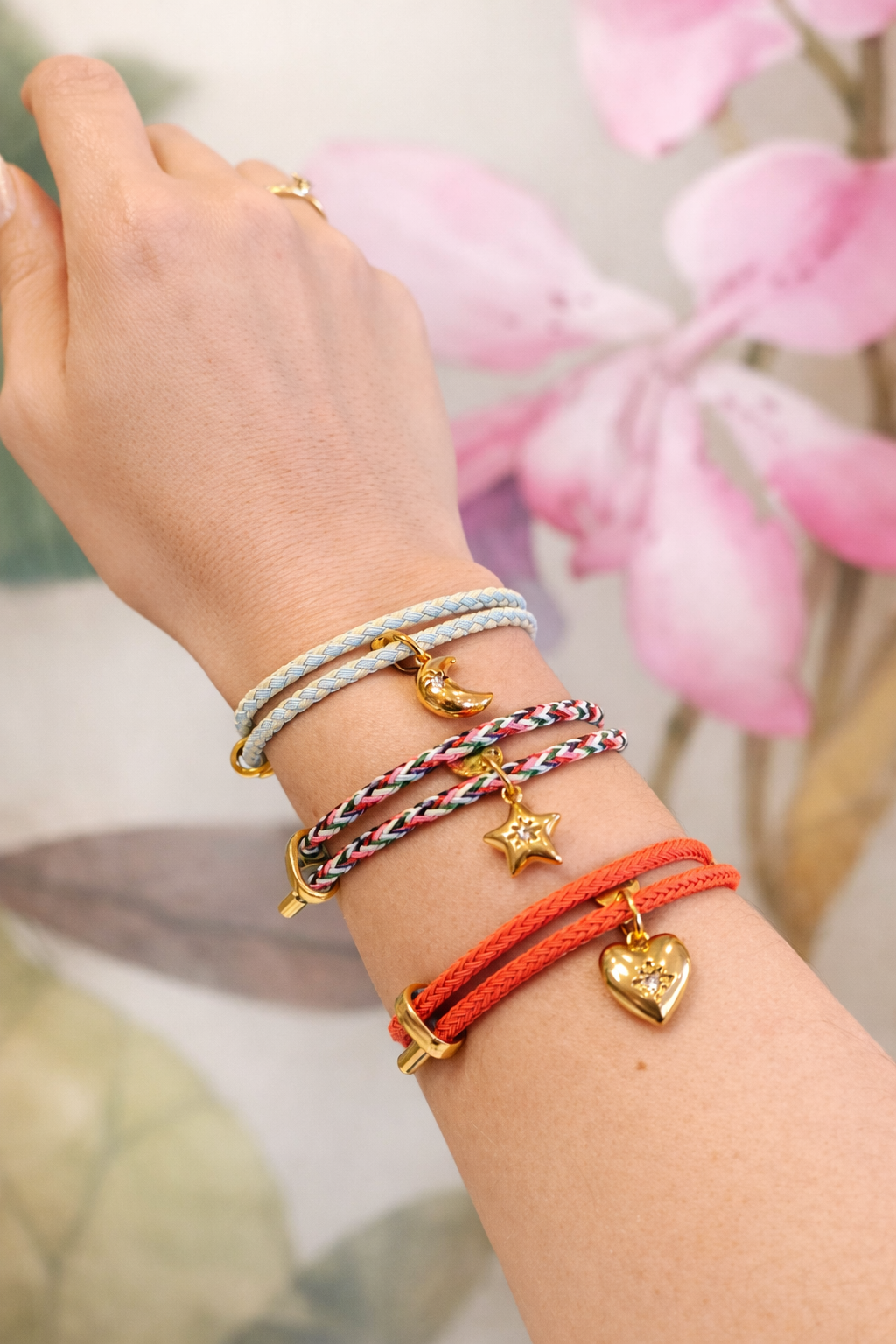 Brazalete especial para charm en varios colores. Con charm en forma de corazón, estrella o luna de acero inoxidable hipoalergénico.